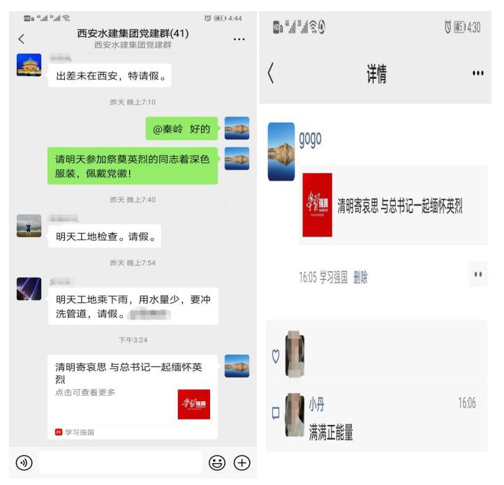 縷縷春風,綿綿細雨,說不及對革命烈士的無限深情,道不盡對烈士英魂的無盡哀思。在黨支部書記的宣傳呼吁下,公司職工紛紛參與了學習強國平臺關于“清明寄哀思 與總書記一起緬懷英烈”的微信轉發活動,并在黨建學習群進行了宣傳轉發,自覺放平手機,為英烈默哀一分鐘。
